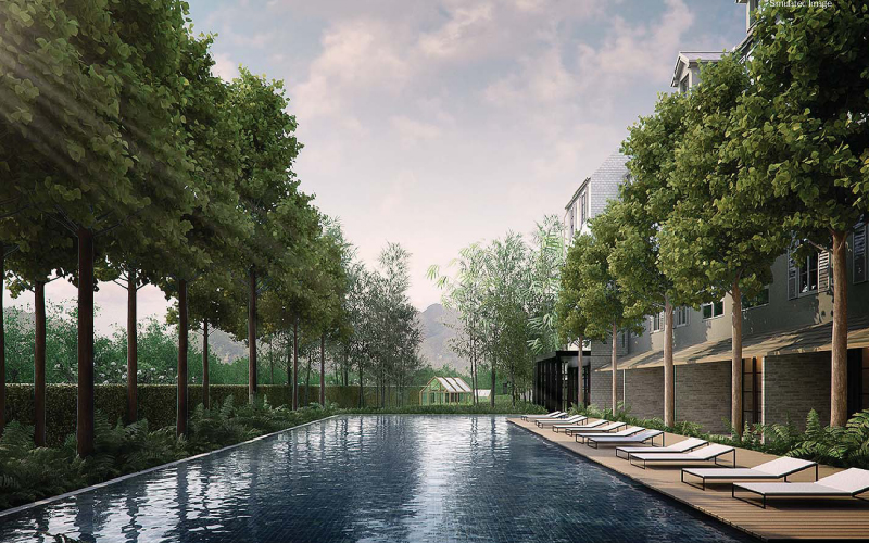 ทุ่งหญ้า เส้นใบของหญ้าที่พริ้วไหวลู่ไปตามสายลม ชวนให้ผู้มาพักผ่อนคลาย ปล่อยอารมณ์ ไปกับธรรมชาติที่รายล้อม และเชื่อมต่อมุมมองจากสระว่ายน้ำให้ต่อเข้ากับทิวเขาเบื้องหน้า